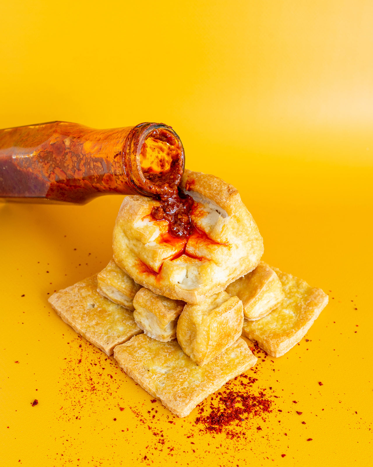 De perfecte hot sauce is voor mij wat grover van textuur en rijk aan umami met rokerige ondertoon. Dus kwam ik terug bij het idee dat ik jaren geleden had, namelijk het maken van een op mapo tofu geïnspireerde hot sauce. Ik mengde hiervoor de smaakmakers uit Lucky Peach’s vegan paddenstoelen mapo tofu, met de basis voor een eenvoudige Louisana-stijl hot sauce van Chili Pepper Madness.