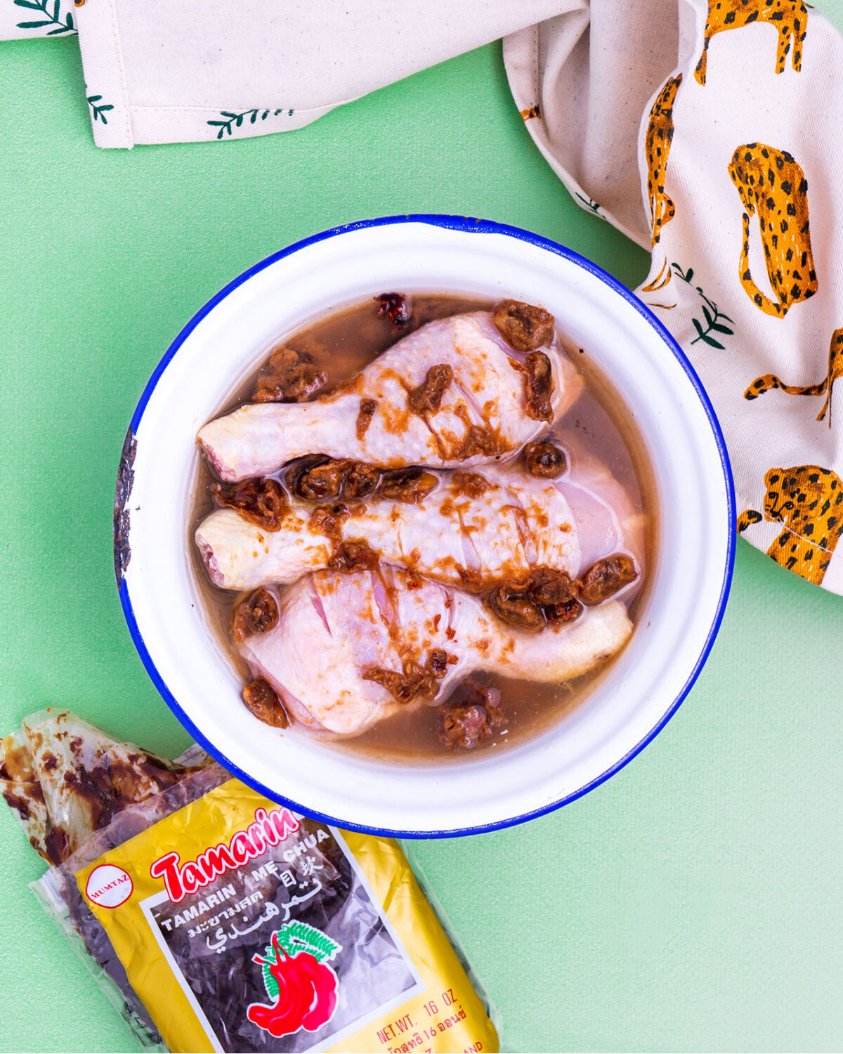 - Snijd het vel van de 8 stukken kip een paar keer licht in en laat het daarna in het asem-water minimaal 8 uur marineren.
