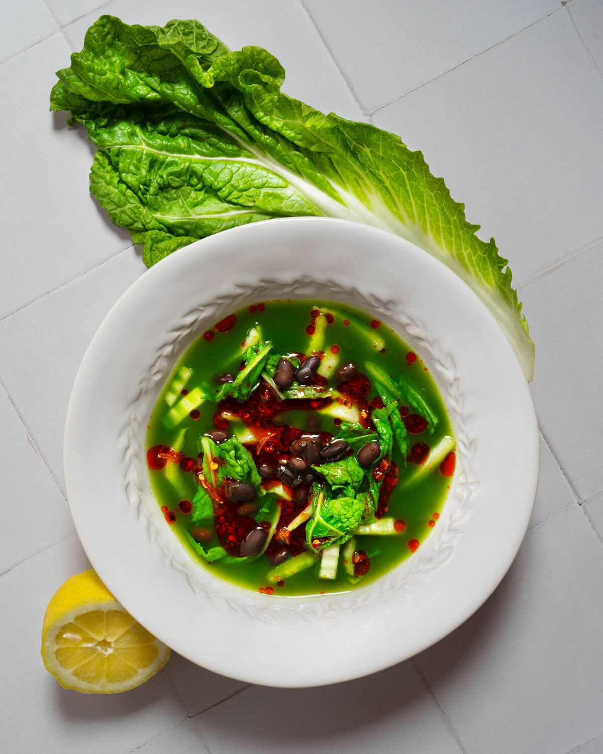 Korianderbouillon met bonen, bladgroen en chiliolie