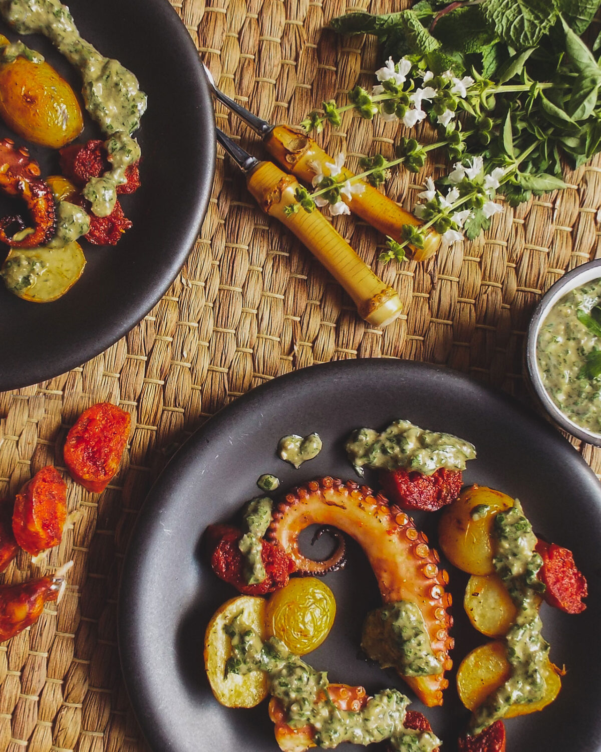 - Begin met wat van de krieltjes en de plakjes chorizo. Drapeer hier de octopus overheen en kledder er als laatste flink wat van de salsa verde overheen.