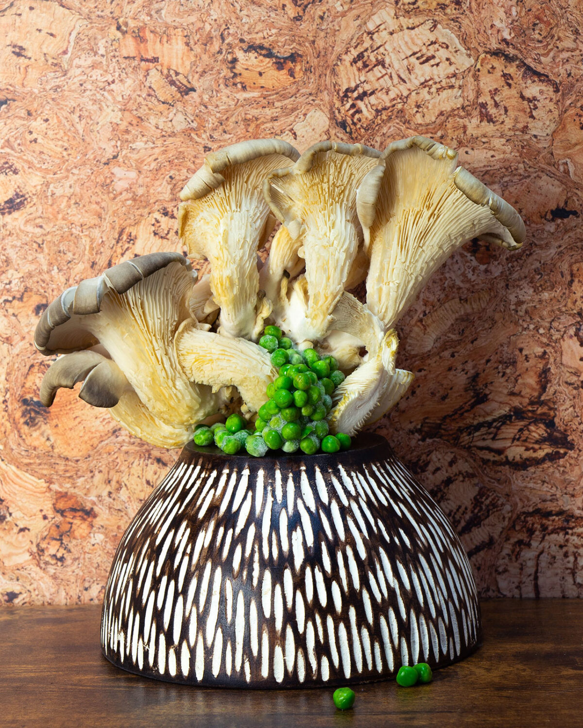 - Voeg nu 200 ml water toe en plaats een deksel op de koekenpan en stoof de oesterzwammen met groene saus nog eens 10 minuten. Voeg voor de laatste 3 minuten 150 gr doperwten toe.